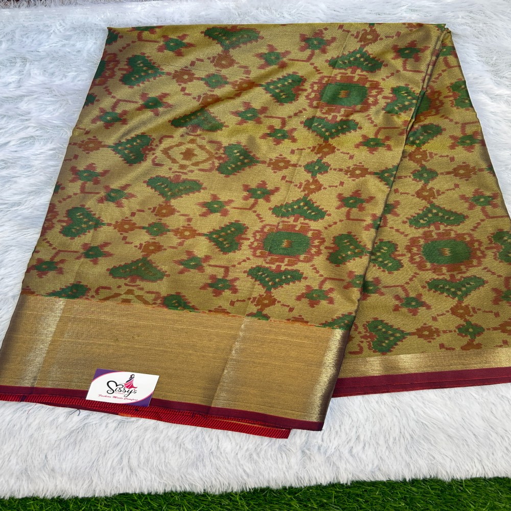 Handloom Pochampally soft silk saree in mustard with traditional ikat motifs and a contrast maroon border; lightweight drape and gentle sheen perfect for festive and wedding occasions.