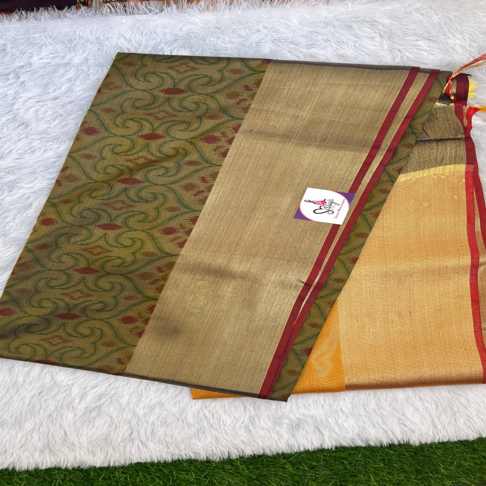 This saree celebrates Pochampally’s ikat heritage, where warp and/or weft yarns are tied, dyed, and precisely matched during weaving to create the signature feather‑edged patterns unique to the region.