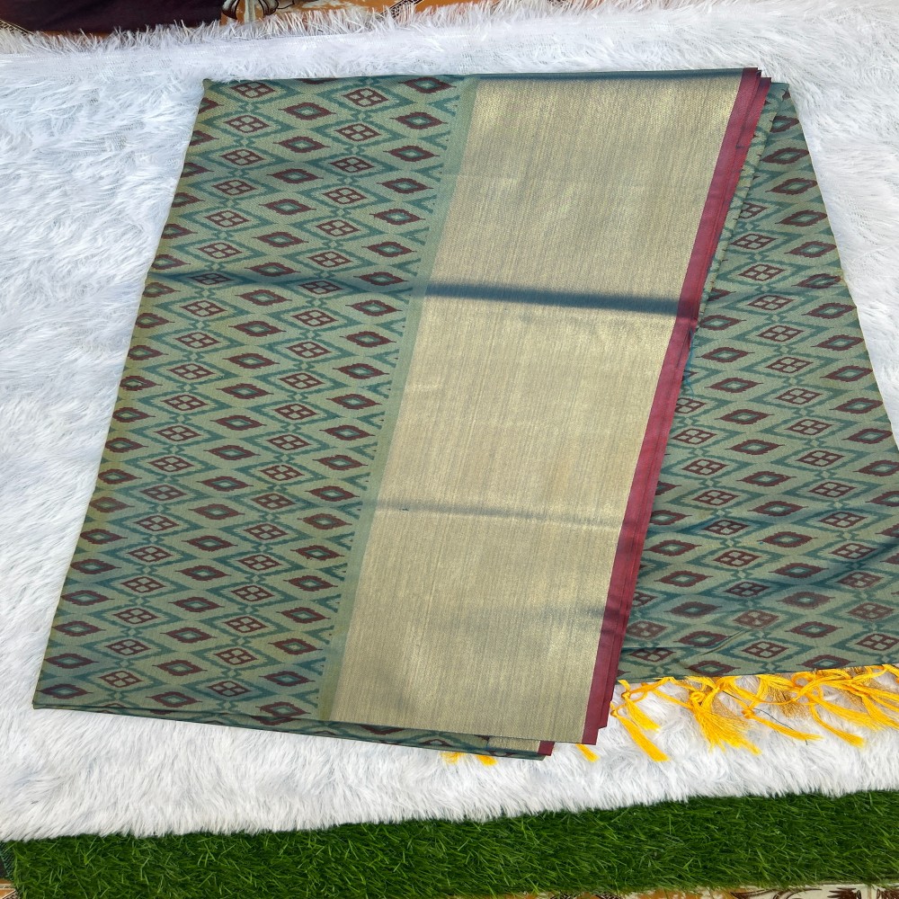 Color and details: Teal‑green body with diamond motifs and contrast maroon border; coordinated pallu and blouse fabric included.